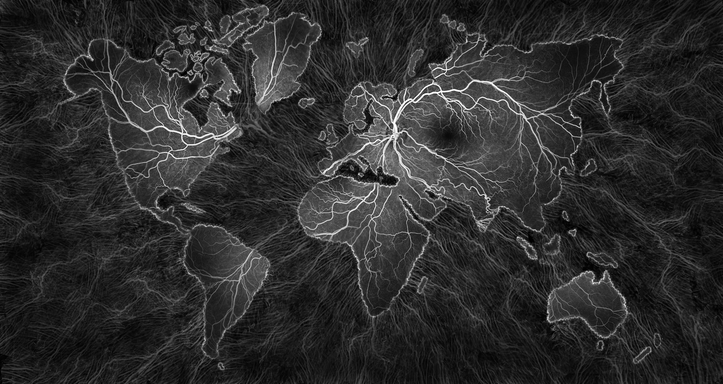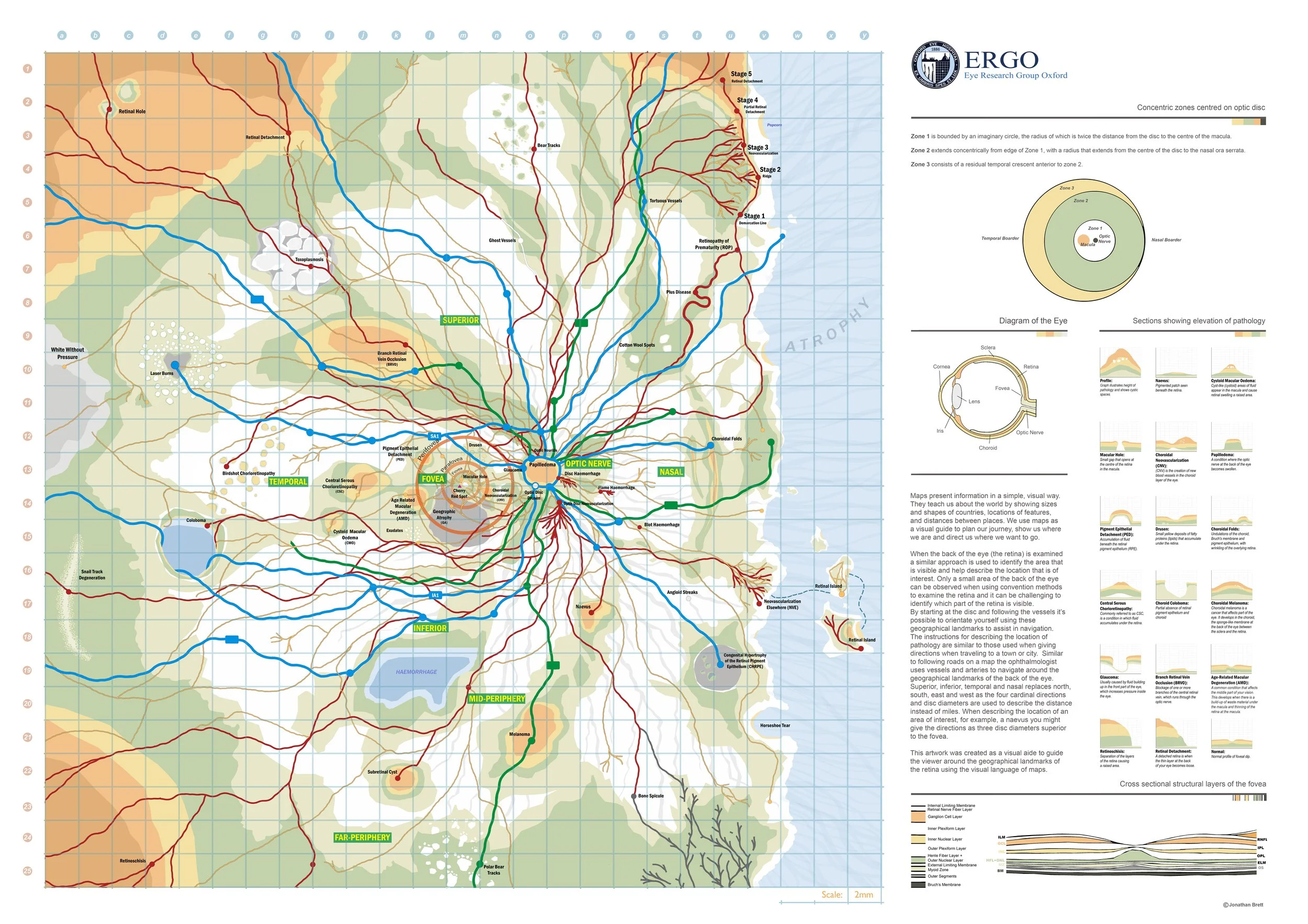 This artwork was created as a visual aide to guide the viewer around the geographical landmarks of the retina using the visual language of maps.