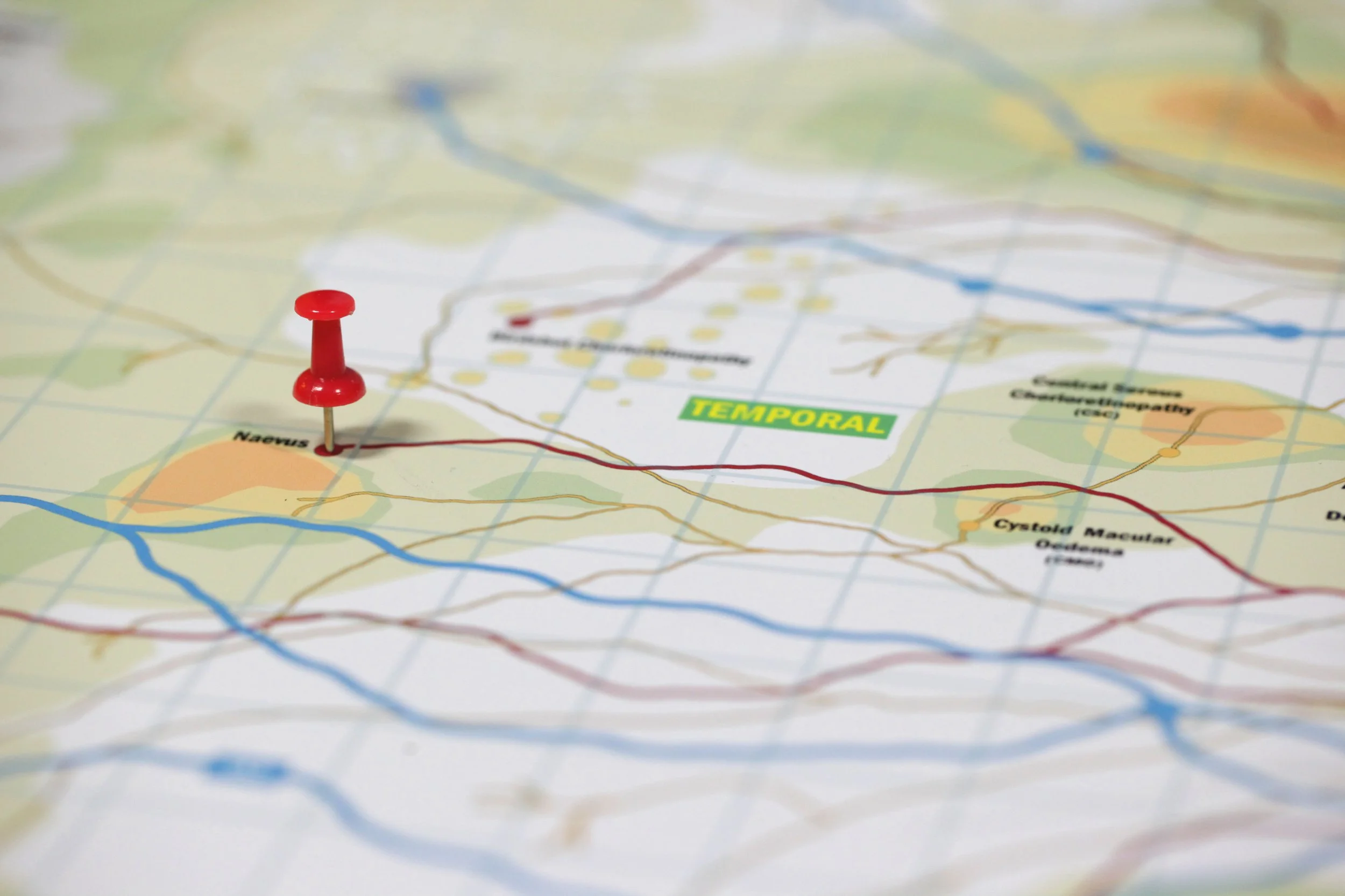 By starting at the optic nerve and following the vessels it’s possible to orientate yourself using these geographical landmarks to assist in navigation. The instructions for describing the location of pathology are similar to those used when giving directions when traveling to a town or city. Similar to following roads on a map the ophthalmologist uses vessels and arteries to navigate around the geographical landmarks of the back of the eye. Superior, inferior, temporal and nasal replaces north, south, east and west as the four cardinal directions and disc diameters are used to describe the distance instead of miles. When describing the location of an area of interest, for example, a naevus you might give the directions as three disc diameters superior to the fovea.