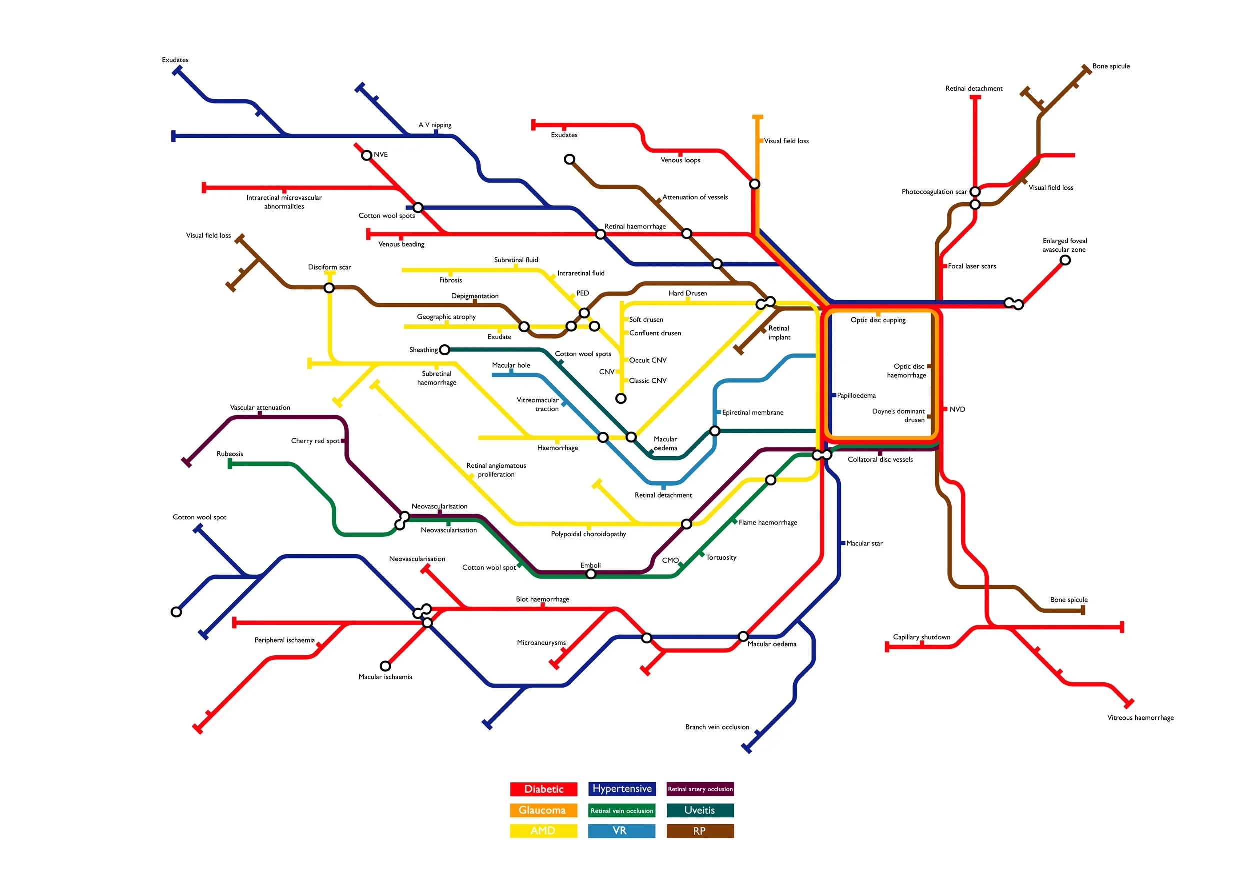 I have been interested in maps and how to display complex information since my training as a graphic designer. Working within healthcare has given me opportunities to explore this further. Before I created the road map I worked on a diagram of the eye using the visual language of the London Underground Map.