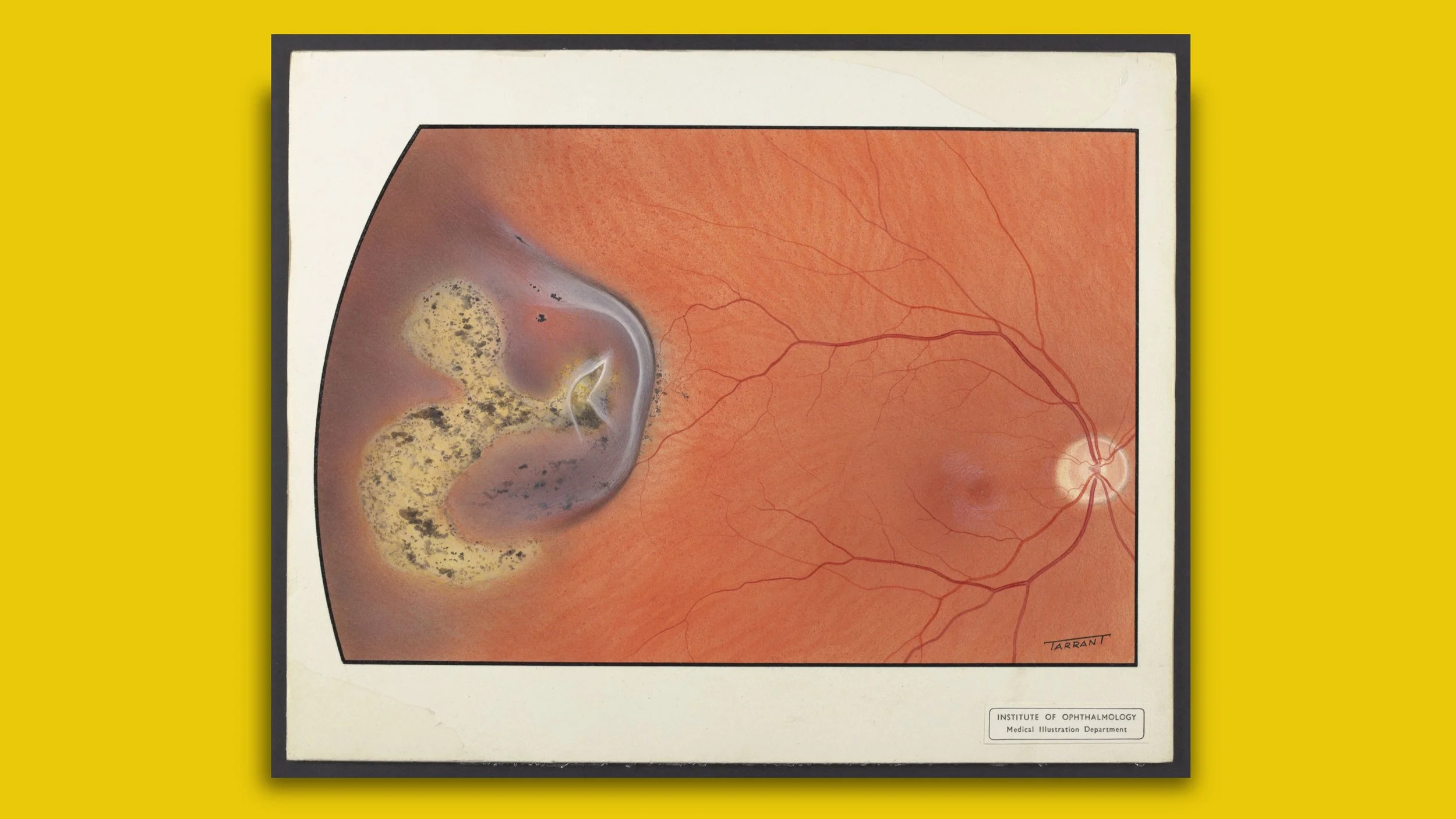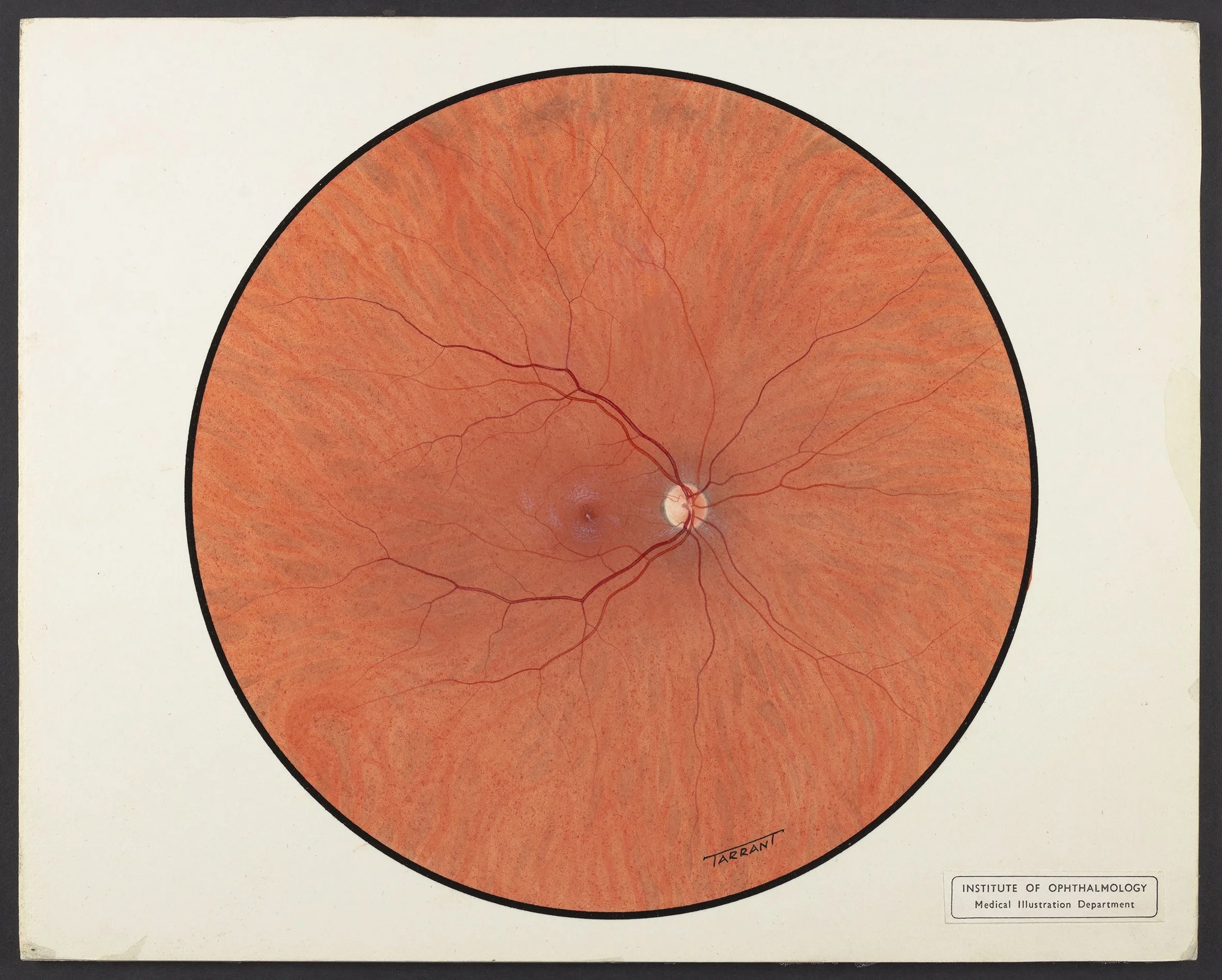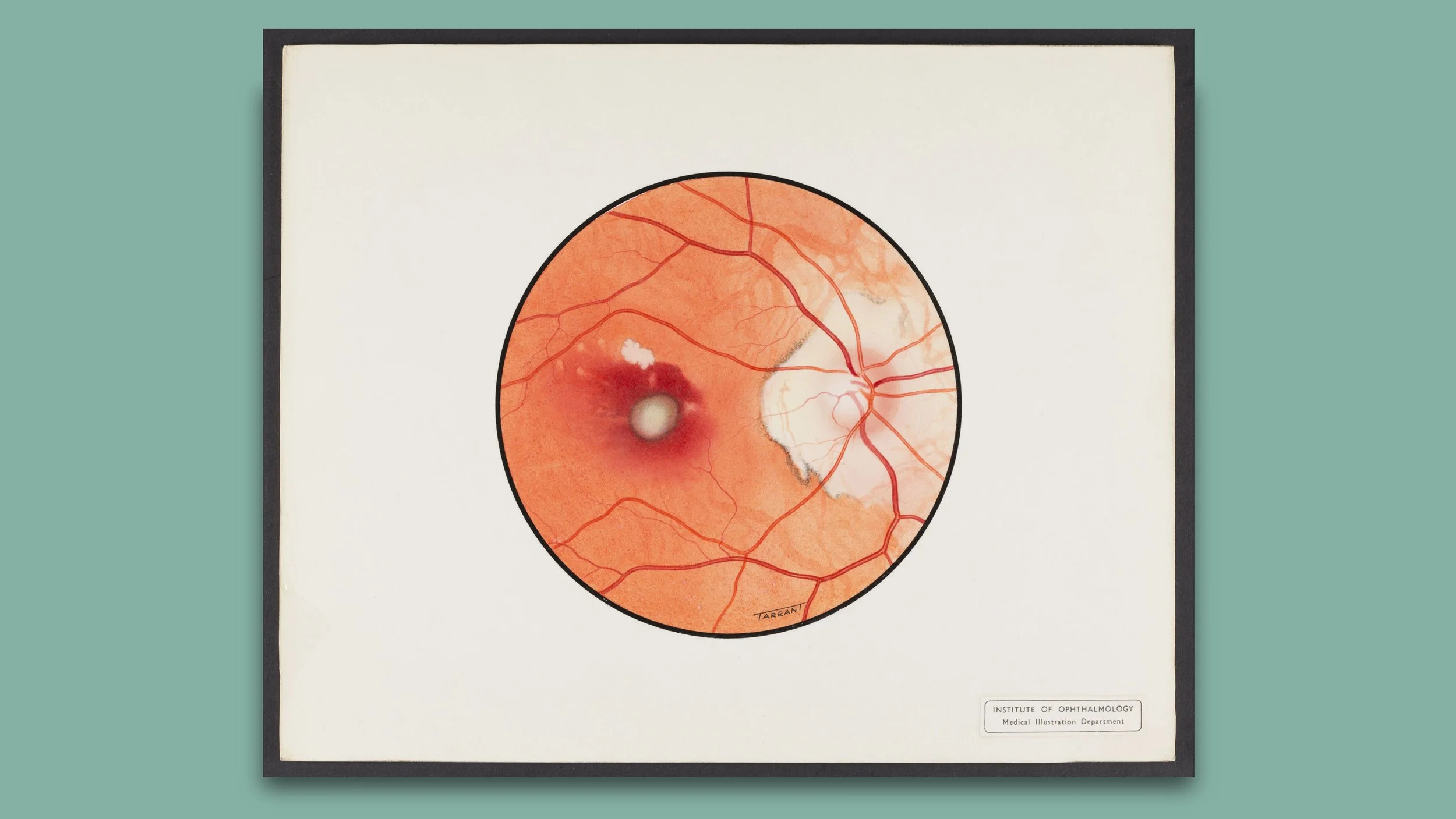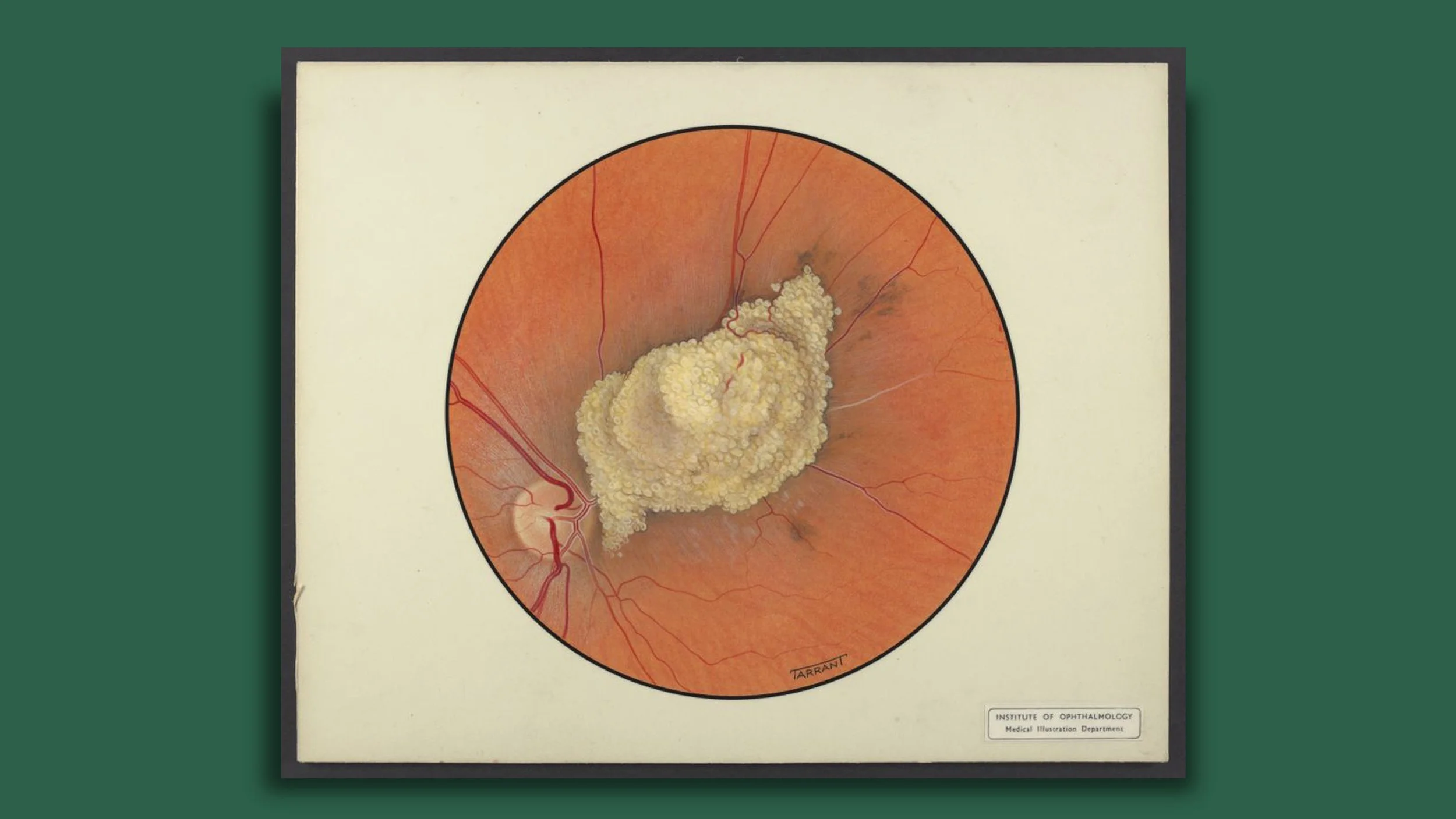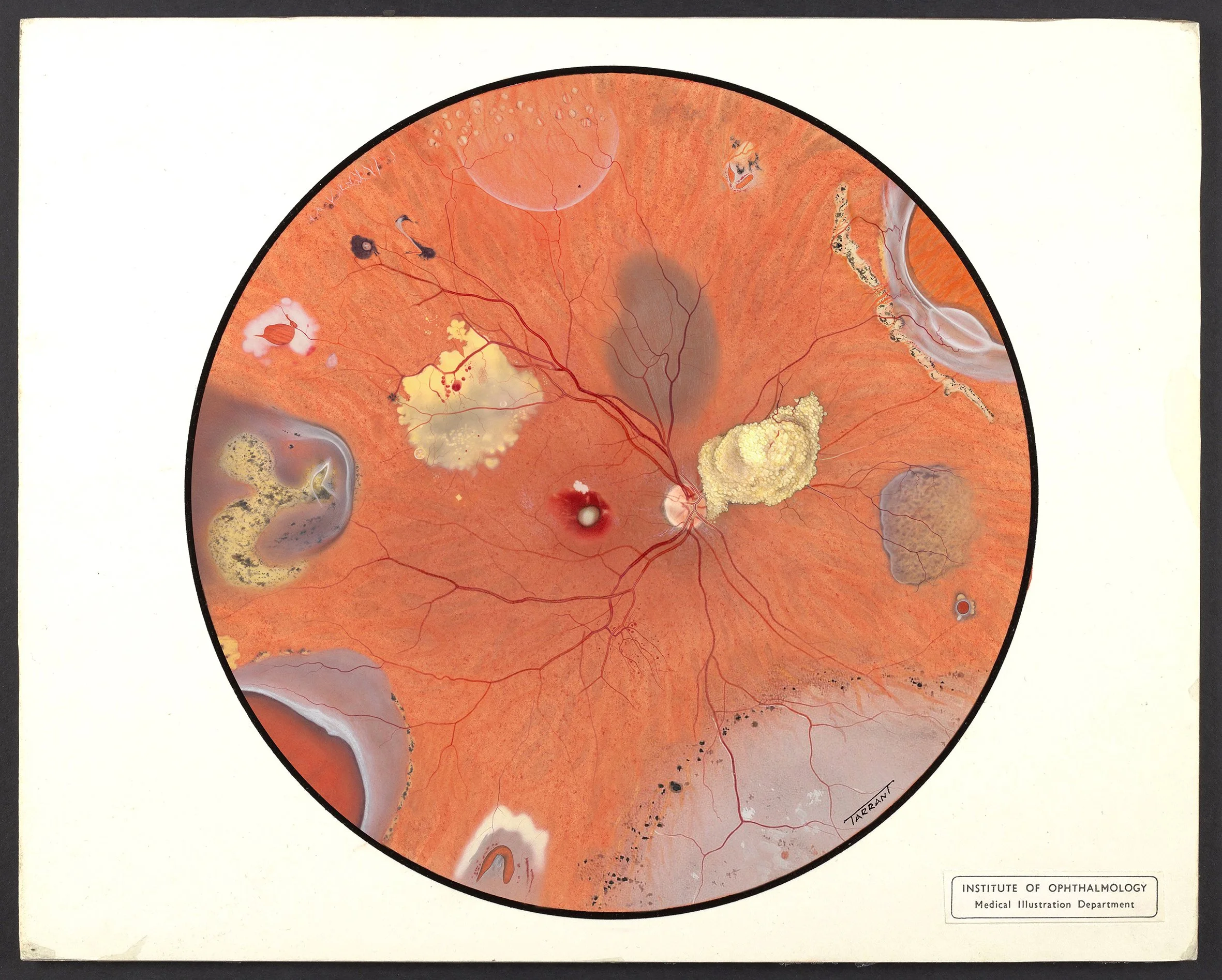My interest in retinal paintings began while working on the 9th edition of Kanski’s Clinical Ophthalmology. Nestled amongst the scans and fundus photographs are beautify painted illustrations of the back of the eye. The majority, feature a single name, Tarrant, in the bottom hand corner. As I later discovered, this name is widely known throughout ophthalmology and the work is highly revered. I was curious to find out more about the paintings, the person behind the name, and the story of why artists painted these unknown worlds.