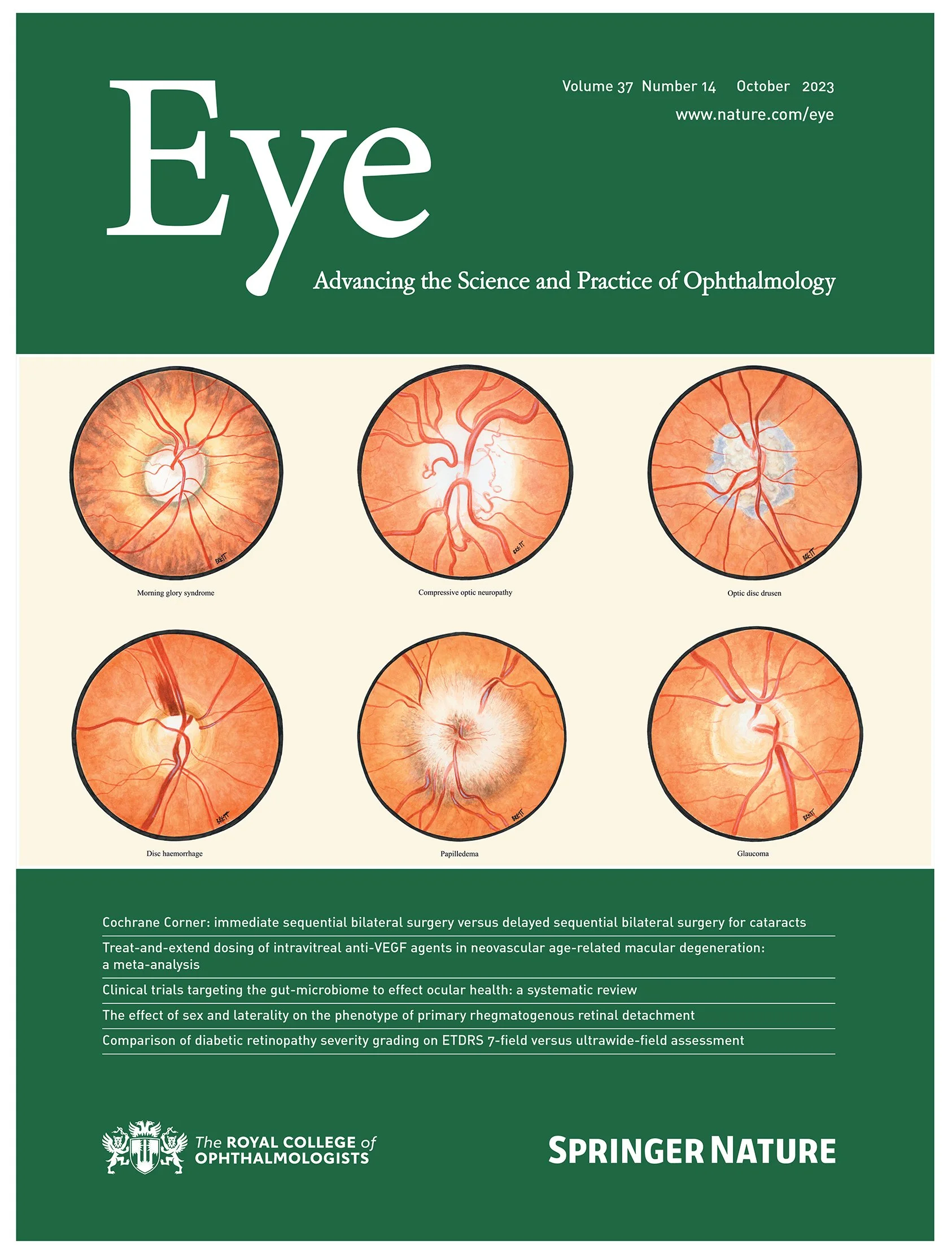 The publication ‘Eye’ was previously called the Transactions of Ophthalmological Society for the United Kingdom (TOSUK) and regularly featured meticulous illustrations accompanying the physician’s description. My retina paintings were included on the cover artwork along with my article which felt like the project had come full circle as the pioneers mentioned in the paper had their work featured in this publication.