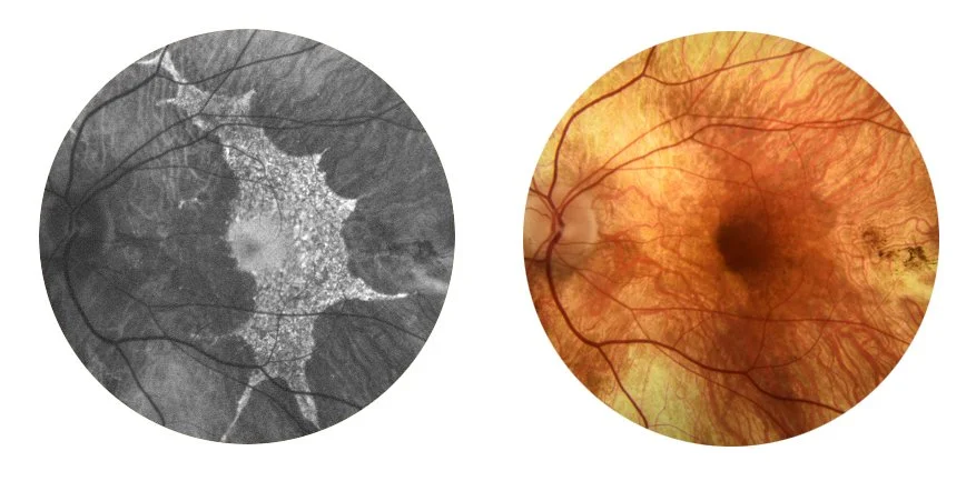 FAF focuses on the fluorescent properties of pigments in the retina to generate images that help us view various disease processes from a different perspective. The images below show how FAF ( left image) can reveal pathology which is difficult to visualise when viewing the retina with an ophthalmoscope or slit lamp (illustrated by the colour fundus image on the right).